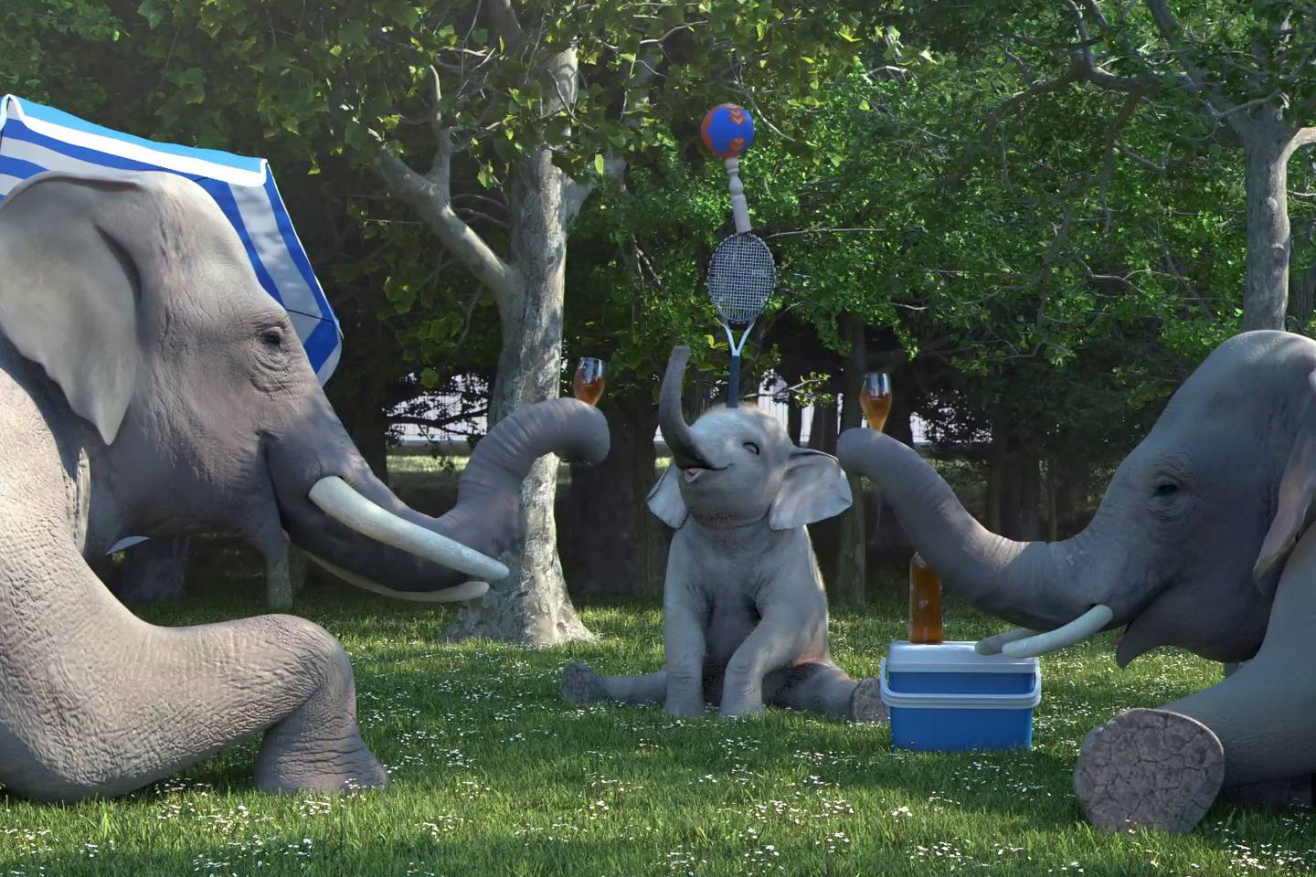 Een hyperactieve baby-olifant vermoeit zijn ouders in het park.