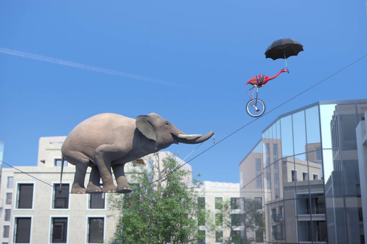 Een flamingo rijdt op een eenwieler op een koord zonder vangnet.